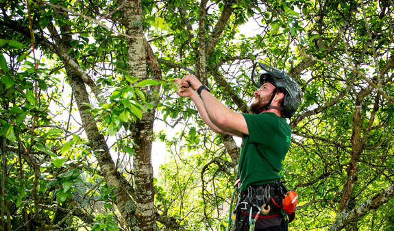 Unser Team hat sich hier seit Anfang an auf die natürliche Seilklettertechnik spezialisiert. Wir müssen keine Leitern bauen oder Hebebühnen ankarren - mit vielen Jahren Erfahrung können wir quasi direkt in den Pflanzen und Bäumen arbeiten.